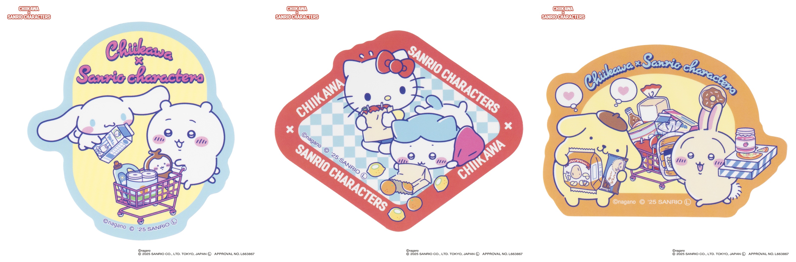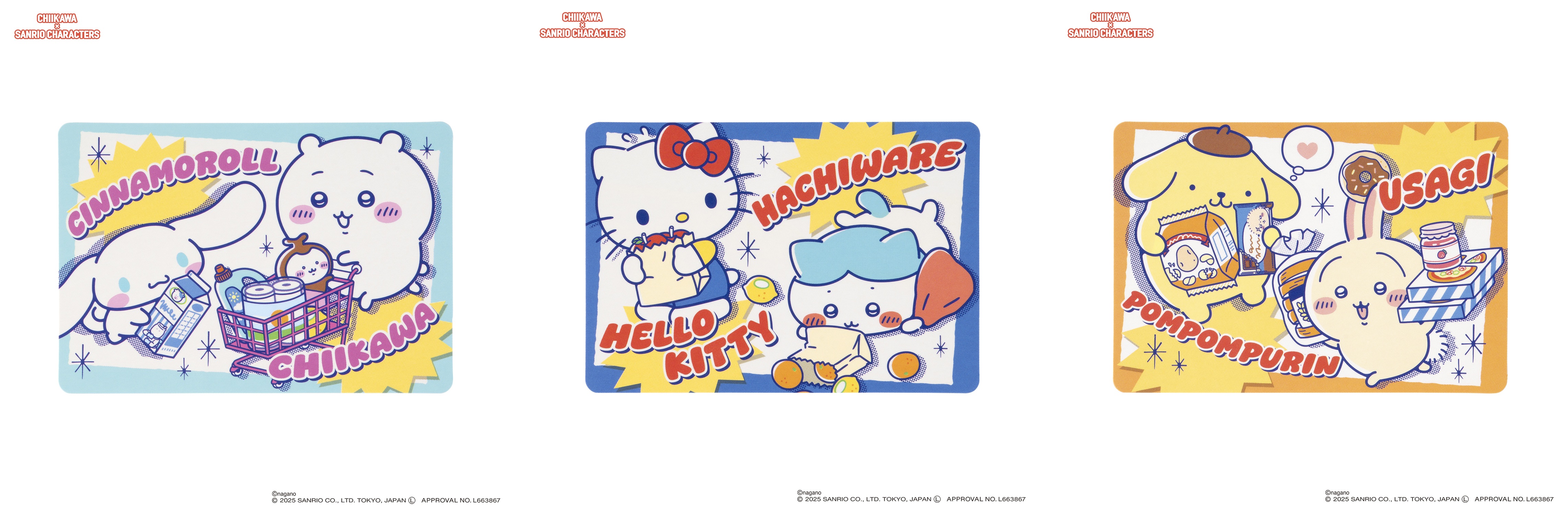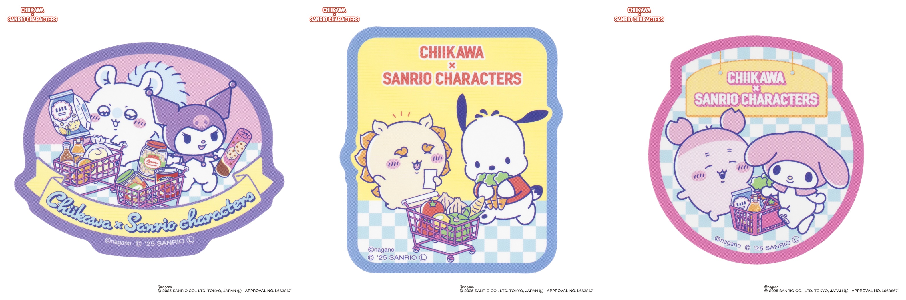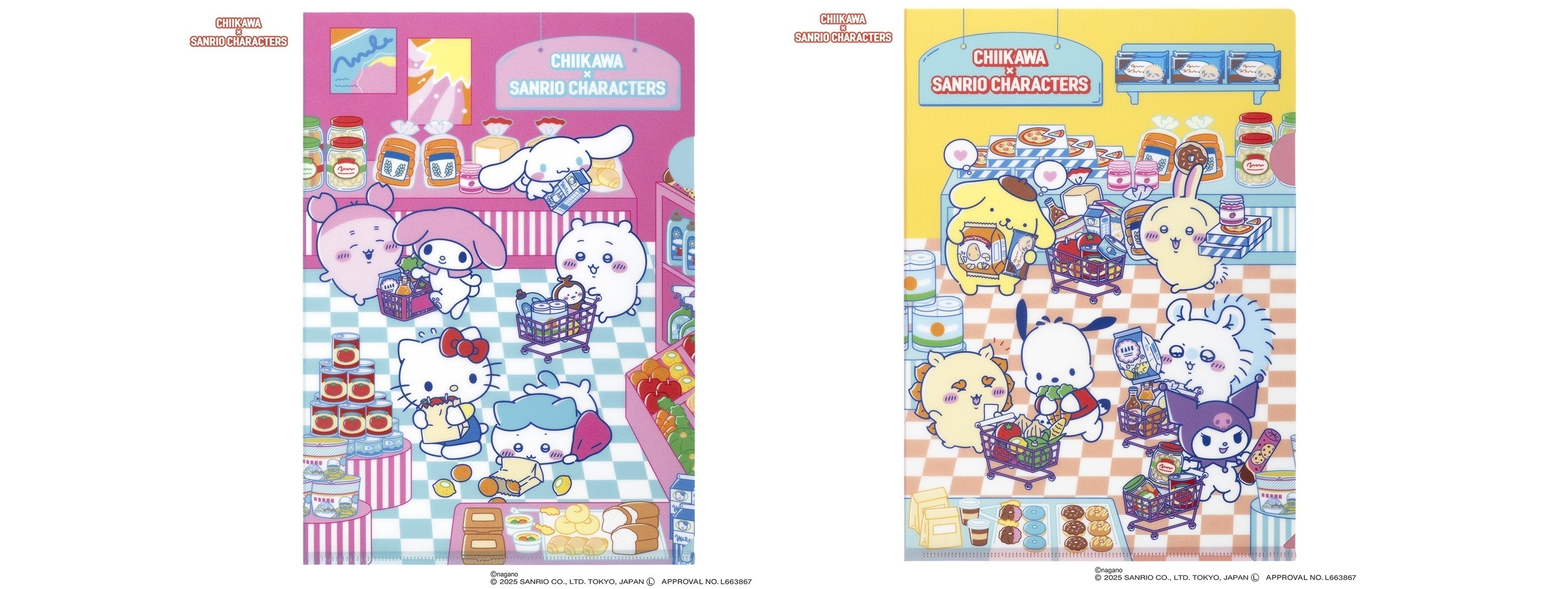 本コラボアイテムのデザインテーマは“スーパーマーケット”。ちいかわとシナモロール、ハチワレとハローキティ、うさぎとポムポムプリン、モモンガとクロミ、シーサーとポチャッコ、古本屋とマイメロディのペアが、なかよく買い物を楽しんでいるキュートなデザインで登場する。