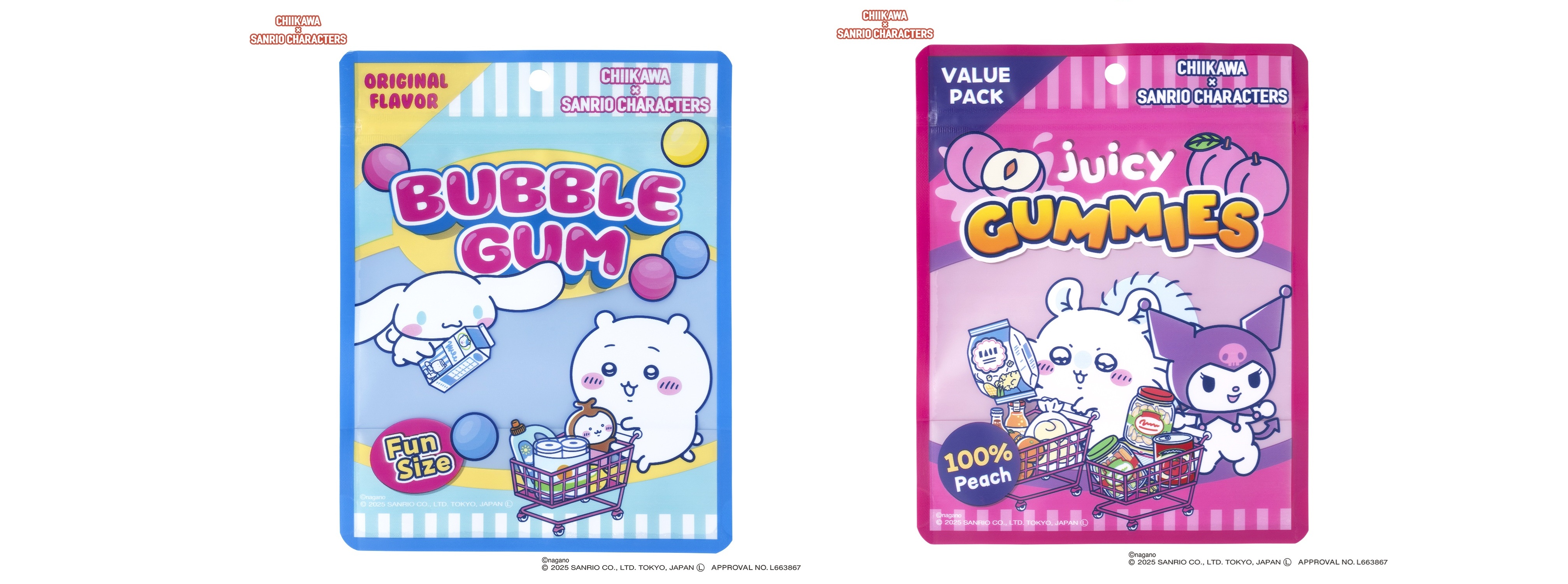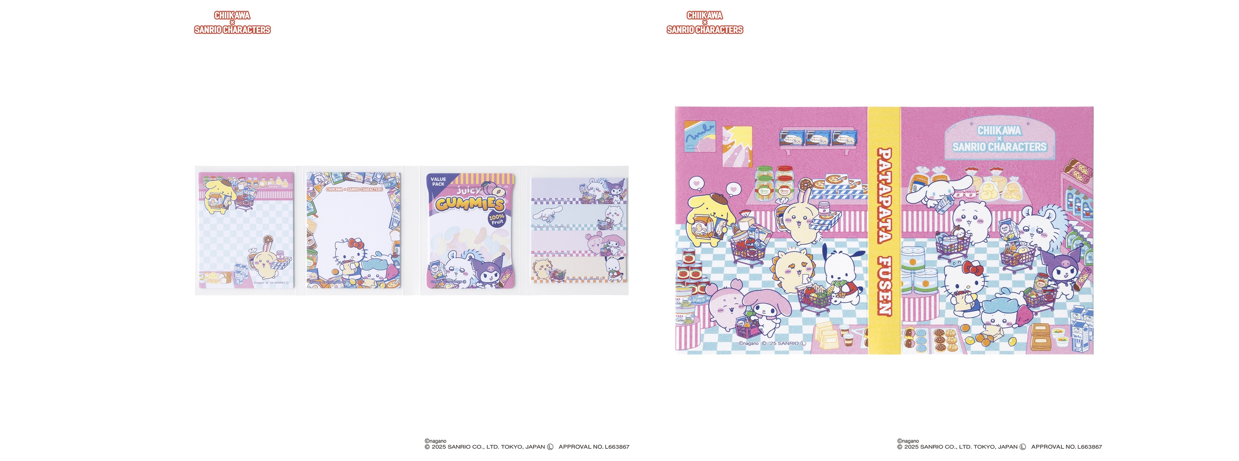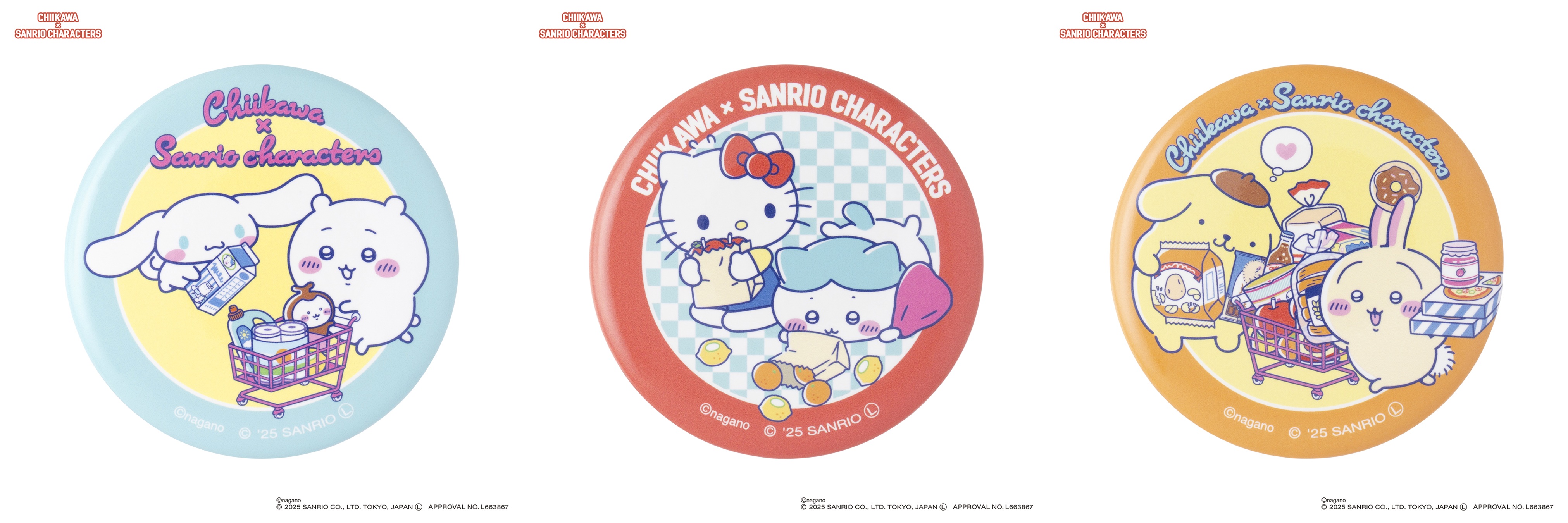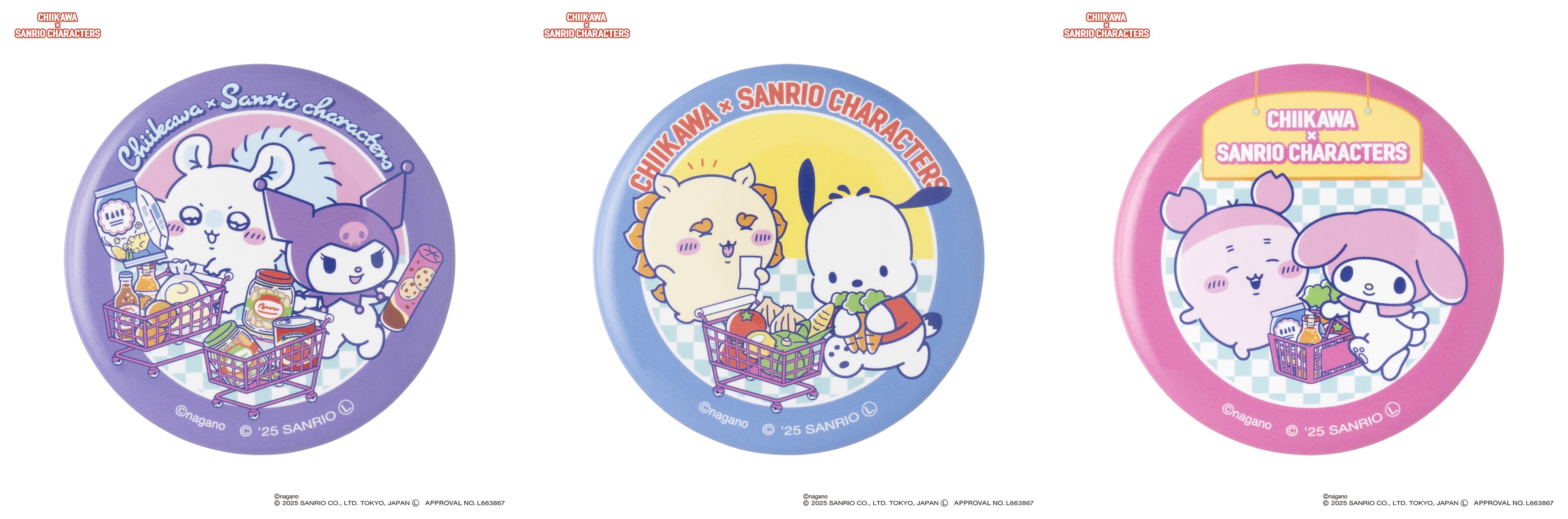 本コラボアイテムのデザインテーマは“スーパーマーケット”。ちいかわとシナモロール、ハチワレとハローキティ、うさぎとポムポムプリン、モモンガとクロミ、シーサーとポチャッコ、古本屋とマイメロディのペアが、なかよく買い物を楽しんでいるキュートなデザインで登場する。