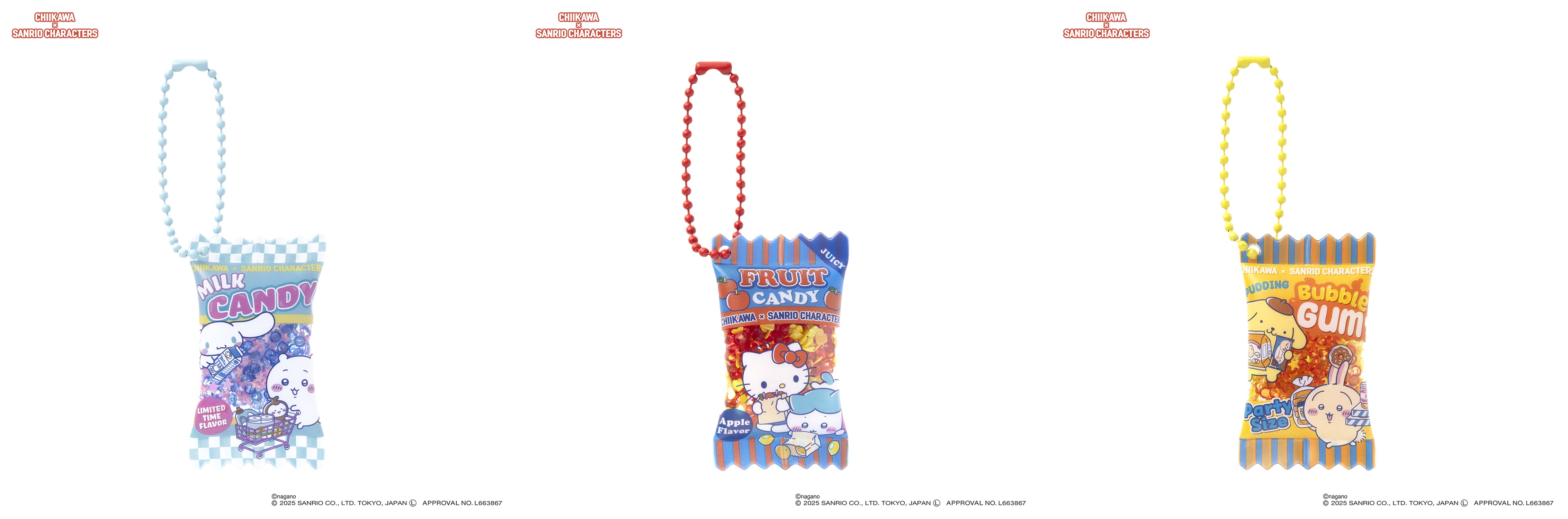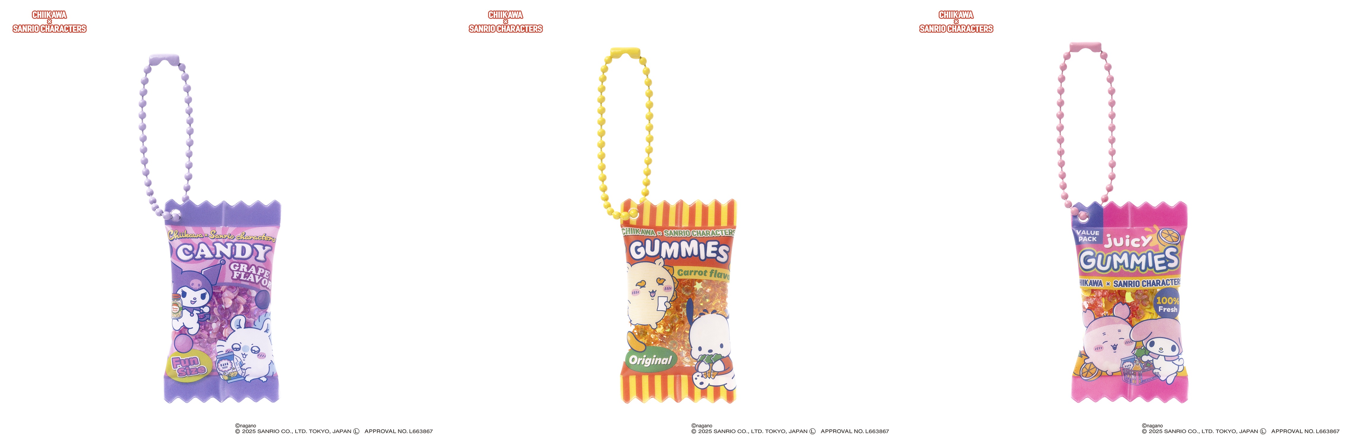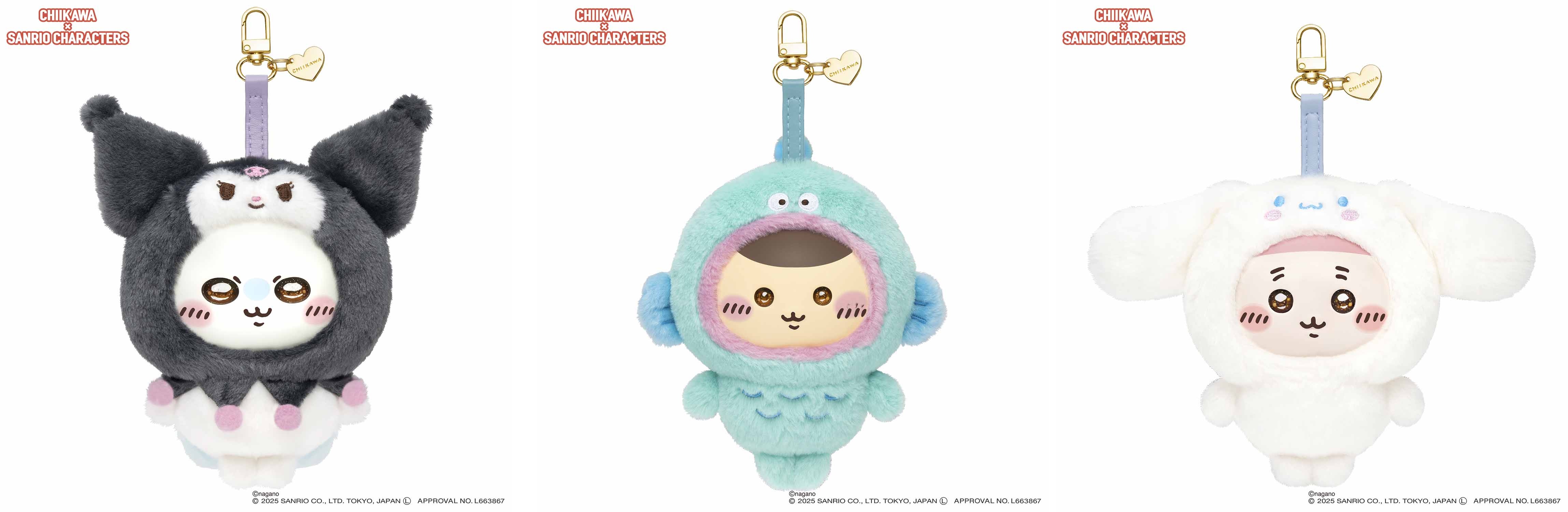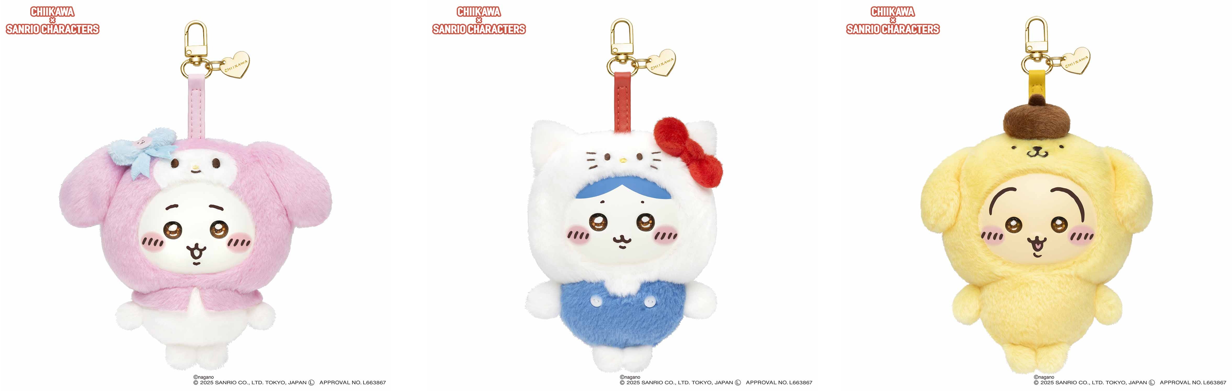 本年10月に同社よりローンチしたアクセサリーぬいぐるみブランド「Kiramekko(きらめっこ)」からも、待望の「ちいかわ×サンリオキャラクターズ」コラボ商品が登場。キラキラ輝く目を持つちいかわたちが、サンリオキャラクターズの着ぐるみを身にまとった、コラボならではの愛らしいデザインに仕上がっている。