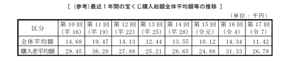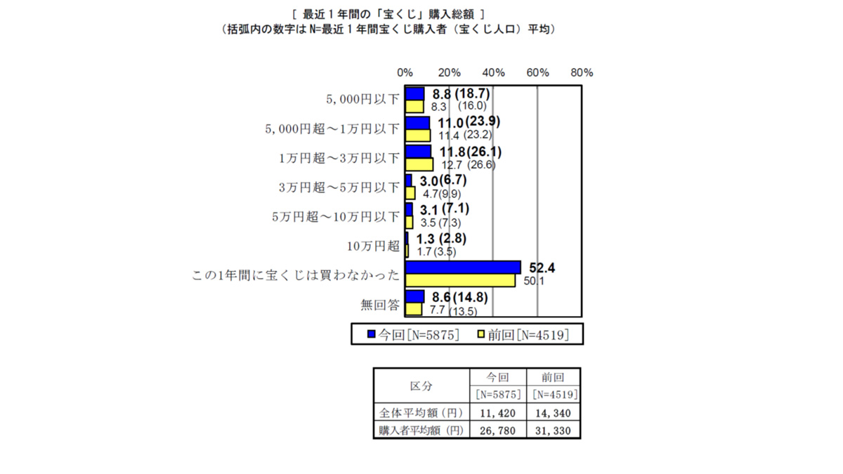 宝くじの購入総額の全体平均額は 11,420 円、購入者平均額では 26,780 円