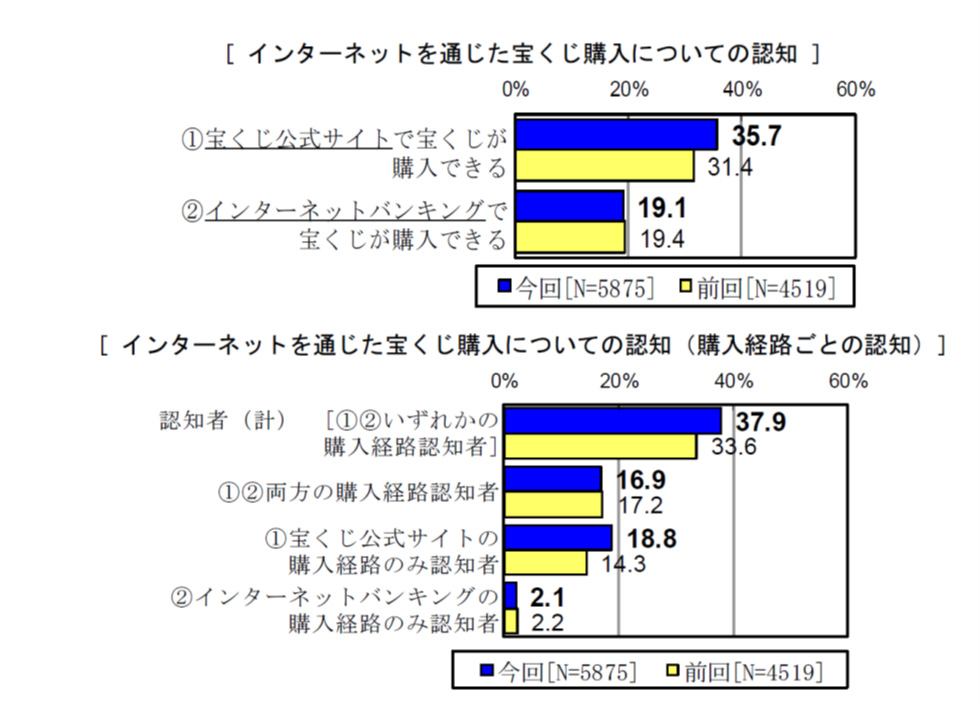 (1)宝くじ公式サイトを通じて宝くじが購入できることの認知率は 35.7%、(2)インターネットバンキングを通じて宝くじが購入できることの認知率は 19.1%となっている。