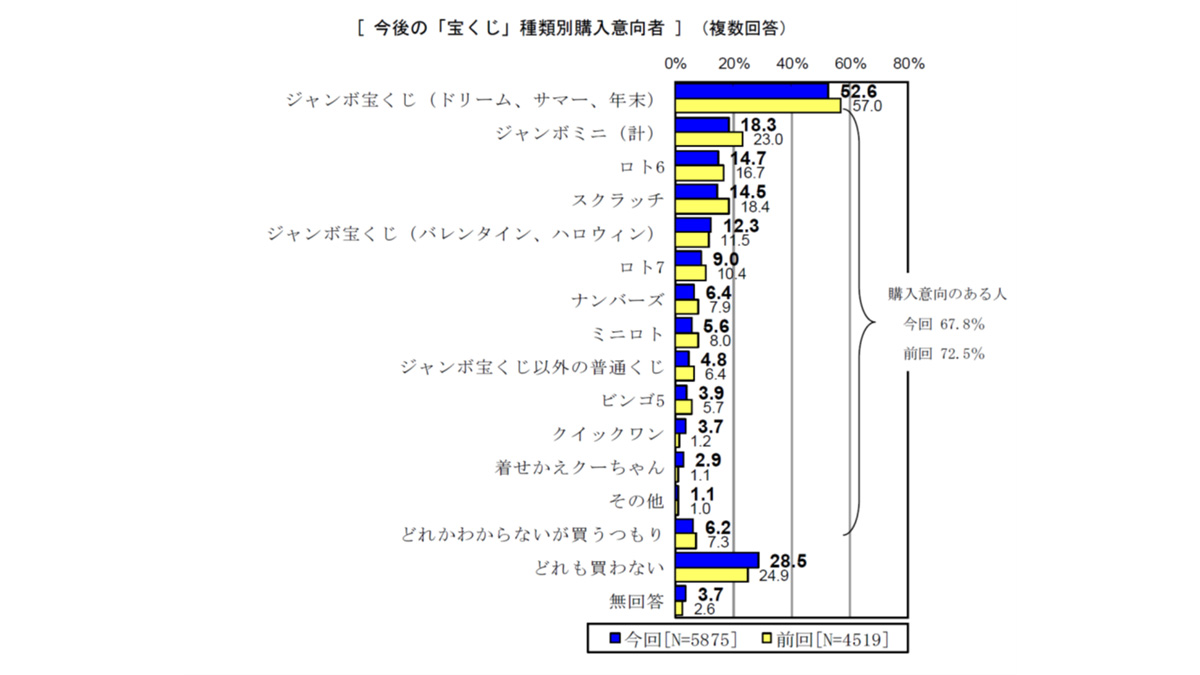 今後、宝くじの購入意向のある人は 67.8%となっている。くじ別では、「ジャンボ宝くじ(ドリーム、サマー、年末)」が 52.6%で最も多く、次いで「ジャンボミニ」、「ロト 6」、「スクラッチ」となっている。「ロト 6」、「ロト 7」、「ナンバーズ」などの数字選択式では、「ロト 6」が 14.7%で最も多くなっている。
