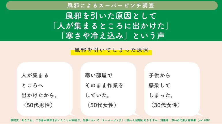 直近1年で風邪を引いたと感じた時期について聞いたところ、最も多かったのが「10-12月(46.8%)」、次いで「1-3月(44.8%)」となった。風邪を引いてしまった原因を自由回答形式で尋ねたところ、「人が集まるところに出かけた」「寒さや冷え込み」「子供から風邪をもらってしまった」などの声が寄せられた。