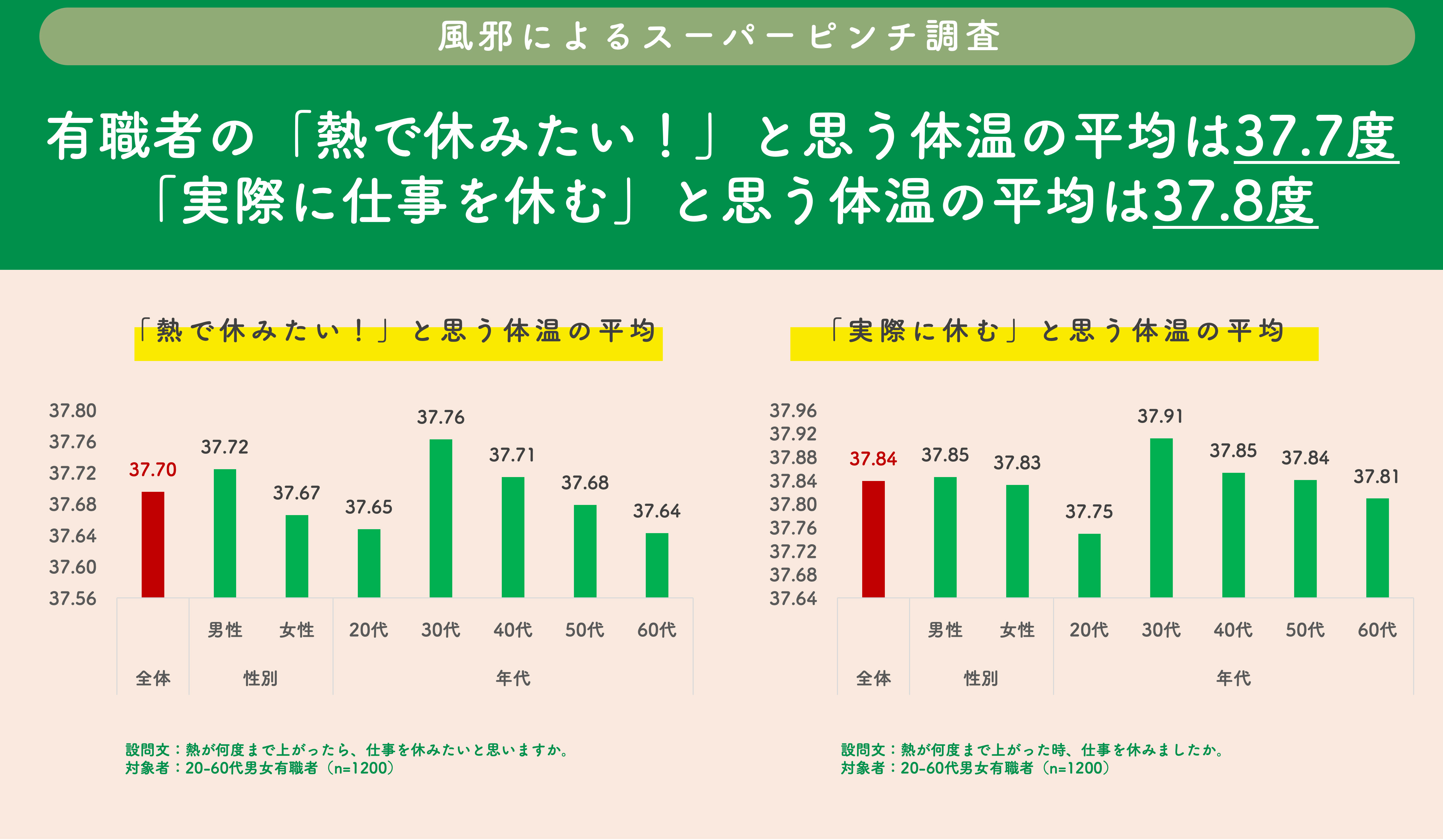 「熱が何度まで上がったら、仕事を休みたいと思いますか」「熱が何度まで上がった時、仕事を休みましたか」と聞いたところ、それぞれ平均が37.70度・37.84度と、休みたい気持ちを我慢して無理して働いてしまっている状況が推察された。