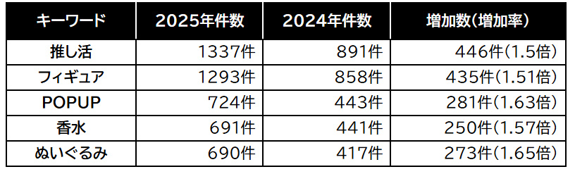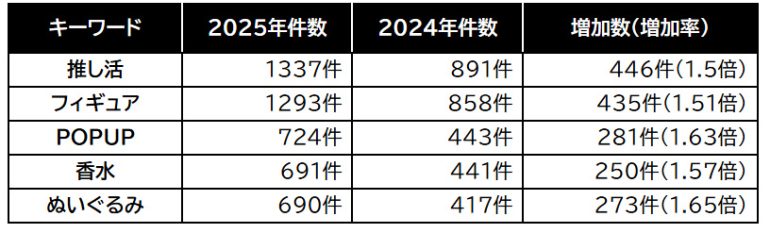 2025年も前年比+446件で1.5倍に増加している。その対象や形式とともに、関連するキーワードも広がっており、「フィギュア」や「ぬいぐるみ」に加え、推し活対象をイメージしたという「香水」なども多く発売され、件数を伸ばした。関連して、「ぬい活」のキーワードも2024年17件から53件と3.12倍に増加している。