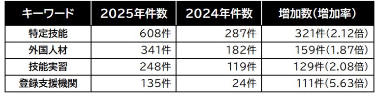 2019年:68件、2020年:164件、2021年:186件、2022年:199件、2023年:207件、2024年:287件。そんな中で2025年には前年比2.12倍の608件と増加した背景には、過去最高の在留外国人数(2025年6月時点、出入国管理庁より)で外国人労働者が増える中で、外国人材関連サービスが資金調達や、大企業による協業など、ビジネス界でも活発な動きが見られる影響と考えられる。