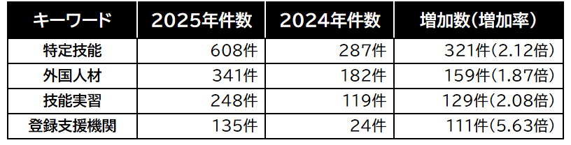 「特定技能」のキーワードは、在留資格制度が創設された2019年に徐々に登場し始め、2020年には前年比2.41倍の164件と増加したものの、以降は横ばいが続いていた。