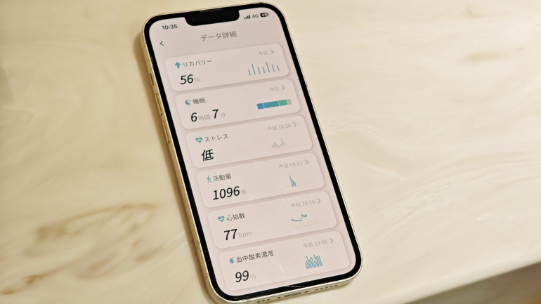 主な機能は、歩数といった活動量のカウント、心拍数や血中酸素濃度の測定、睡眠状態やストレスレベル、回復量のモニタリングとなる。特に重視しているのがリカバリー(回復度)と、それに伴う睡眠状態とのことで、リカバリー度合いを数値化し、入眠時や起床時に心地よいサウンドの再生をする機能や、回復度が低い場合に、10分から15分の仮眠を促す機能などが搭載されている。