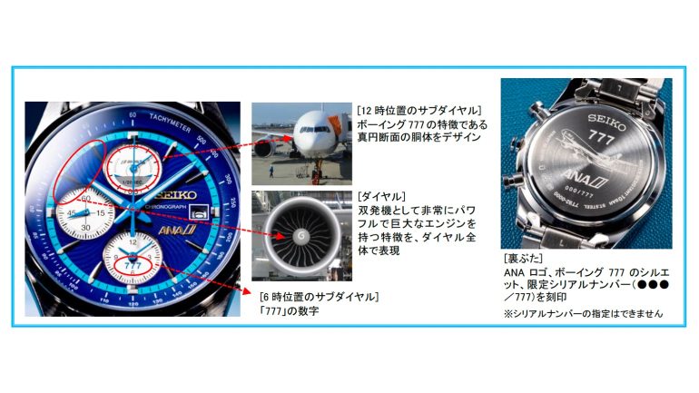 全日空商事はANAのボーイング777型機の就航30周年記念商品として、セイコーウオッチとANAのコラボレーションウオッチ『SEIKO for ANA 777デザイン』を新たにラインアップ。