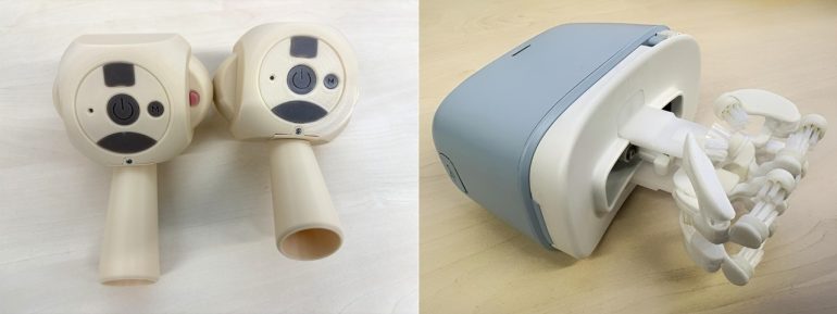 小学生から高齢者まで200台以上が日常生活で活用された、3Dプリンター製の限定モデルのテスト販売を経て、今回新たにユーザーの意見を反映し改良。新モデルは最大42%小さくなり、重さも約100g軽量化されて子どもでも持ちやすくなった。(※下記画像左が限定モデル、右が新モデル)