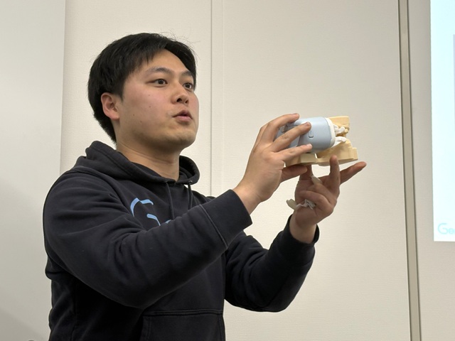 実際に口腔マッサージを試してみたが、予想以上に口の中が動かされる感じ。ほうれい線対策で表情筋を動かすトレーニングがあるが、それに近いような感覚でこれは美容にもイケるのではないか?と栄田社長に聞いたところ、将来的には美容系の領域にも応用していきたいとのこと。