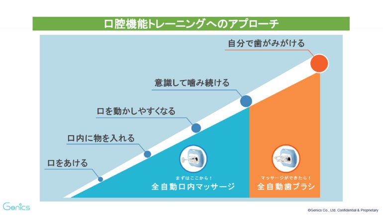 全自動口腔内刺激については、口が開かない、口にものを入れるのが大変、口の中を刺激することに慣れてない、意識して噛めないといった口の機能に対する課題を持っている方が相当いることがヒアリングでわかったことから、歯みがきで困っている方々に対して歯みがきの支援ができないかと、アタッチメントを新たに開発しました。