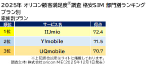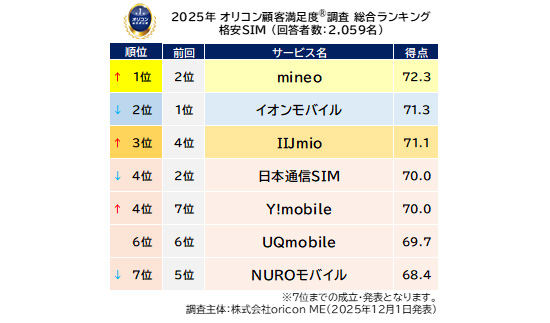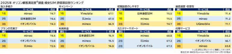 『格安SIM』ランキングでは、「mineo」が2021年以来4年ぶり3度目の総合1位を獲得した(2018年、2021年、2025年)。総合2位は「イオンモバイル」、総合3位には「IIJmio」が入った。