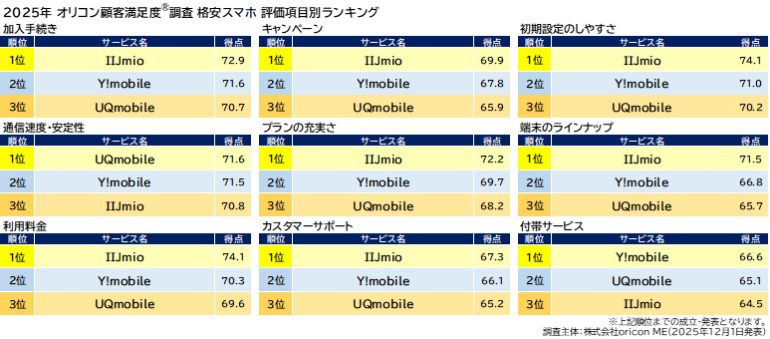 オリコンは、グループ会社であるoricon MEが、実際のサービス利用者を対象に第三者の立場で実施した、『格安SIM』『格安スマホ』についての顧客満足度調査の結果を、2025年12月1日(月)14時に「オリコン顧客満足度」公式サイト内にて発表したので、詳細をお伝えしよう。