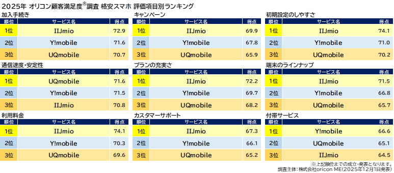 『格安スマホ』では「IIJmio」が2年連続3度目の総合1位を獲得した(2022年、2024年、2025年)。