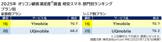 「家族割プラン」「シニア割プラン」は「Y!mobile」が1位