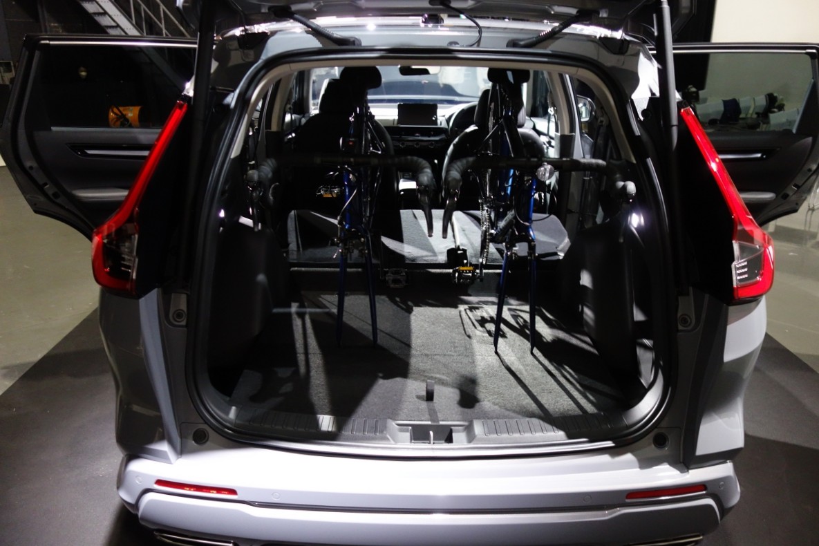 ZR-Vの370Lに対して589L!!もの容量を誇るラゲッジルームは掃き出しフロア(開口部に段差なし)であるとともに、後席両側を倒せば前輪を外した自転車2台を積み込め、6:4分割の後席片側だけ倒した状態でもゴルフバッグ2セットと大型スーツケースを積み込める大容量となっている。