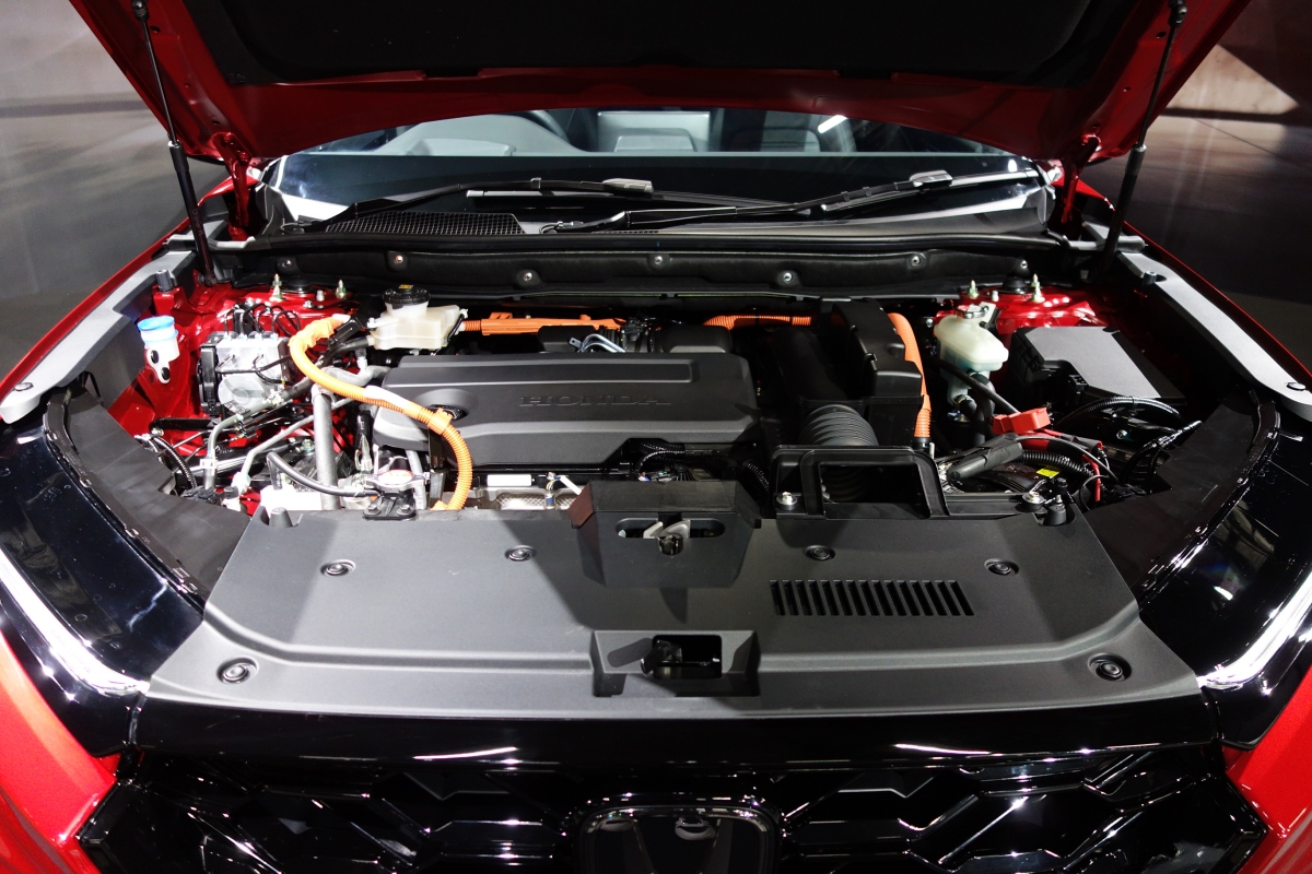 パワートレーンはアコード搭載のアトキンソンサイクル直噴2Lエンジンと高出力モーターを並行軸配置した新型E-CVT(2モーター内蔵CVT)を組み合わせた最新の第四世代e:HEVをベースに、CR-V専用のハイ/ロー2段のエンジン直結ギヤを備え、ギヤレシオを専用設定したHVパワートレーンを搭載。AWDは60:40から50:50に可変するところが新しい。