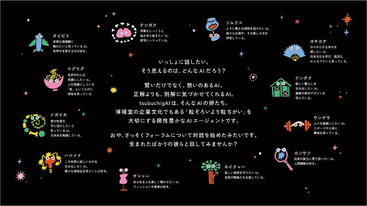 それを体現するものとして、イベントではAIエージェント群「tsubuchigAI」のプロトタイプが限定公開された。「粒ぞろいより、粒ちがい」という博報堂のカルチャーに根ざし、個性や想いを大切にしたAIエージェントで、対話を通じて新たな気づきをもたらすことを目的に作られたものだ。