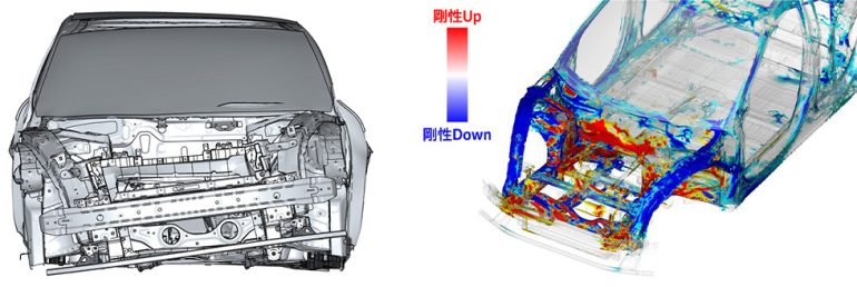 ●ダイナミクス性能を左右する操縦安定性の新たな指標として「新操安剛性マネジメント」を確立。ボディー剛性の最適化により、車体を軽量化すると同時に、コーナーリング時に車体がしなるような挙動を与えることで、タイヤへの荷重をコントロールし接地力を向上。これまでにない操縦安定性と軽快で気持ちの良い走りを実現。なお、この技術はEV向けのプラットフォームにも採用予定。