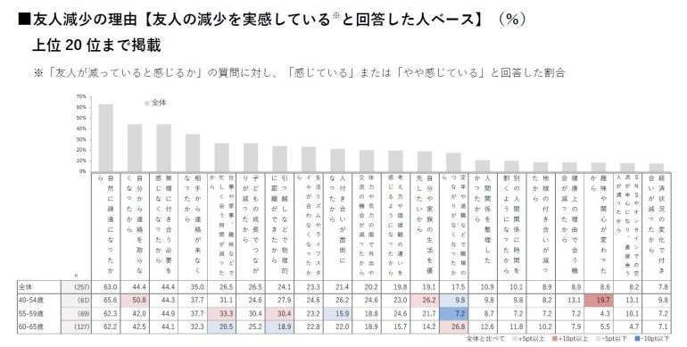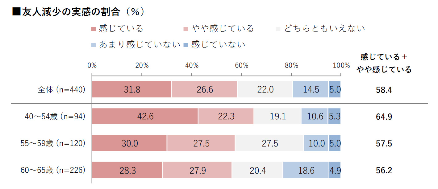40-65歳女性の58.4%が、友人の減少を実感していると回答。特に40-54歳では64.9%と若年層ほど減少を実感していることが判明。