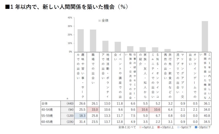 「この1年以内で、新しい人間関係(友人・知人など)を築いた機会はありましたか?」という質問では、「趣味や習い事・サークルでの出会い(26.6%)」「イベントや講座での出会い(11.8%)」「SNS・オンラインコミュニティでの出会い(5.2%)」などが一定数存在。年齢を重ねても人とのつながりを求める姿勢がうかがえる。