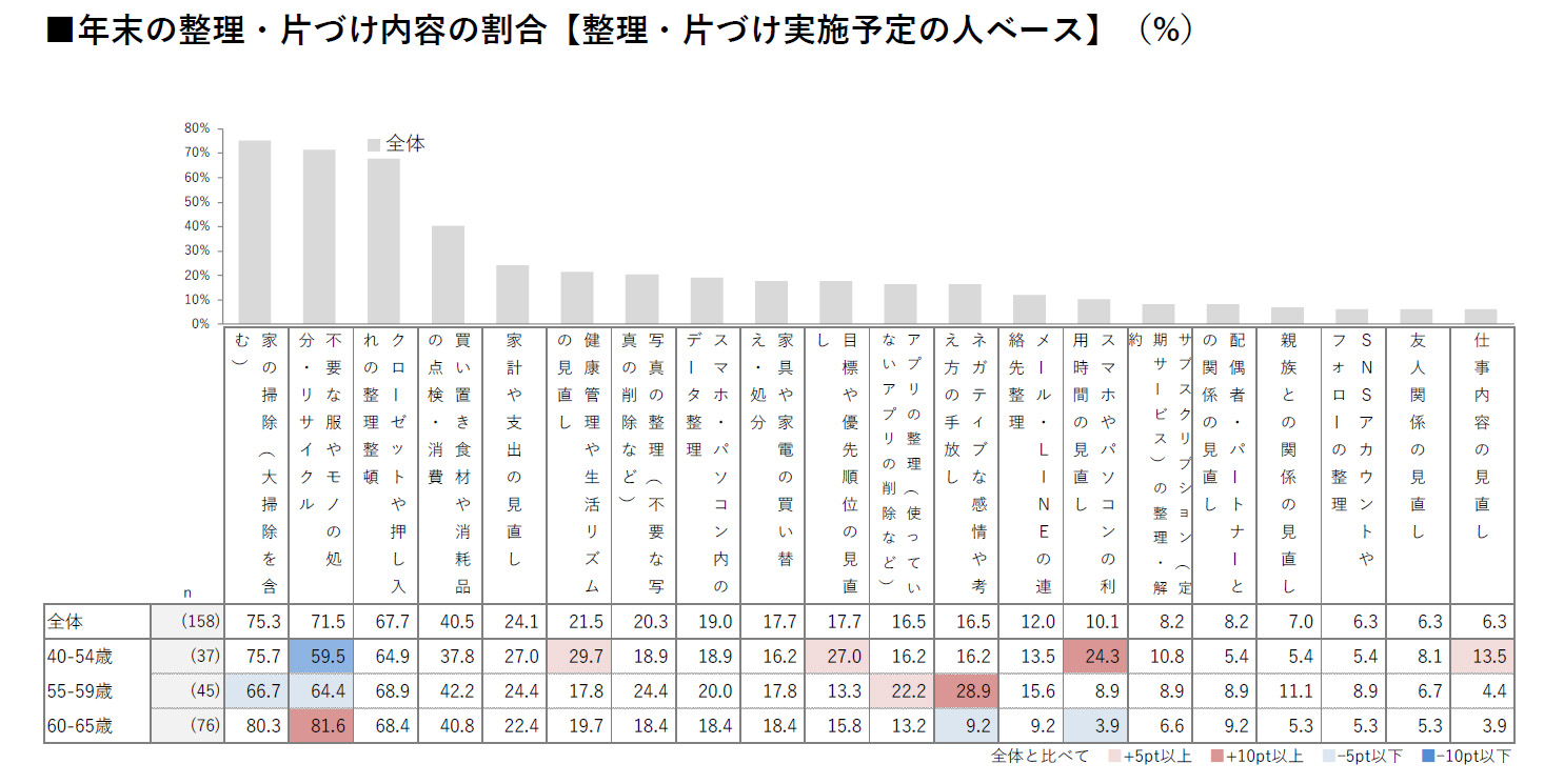 年末に整理・片づけの「実施意向あり」と答えたのは35.9%であった。最も多いのは「家の掃除(大掃除を含む)(75.3%)」。「不要な服やモノの処分・リサイクル」については、60-65歳(81.6%)で高く、40-54歳(59.5%)は低め。