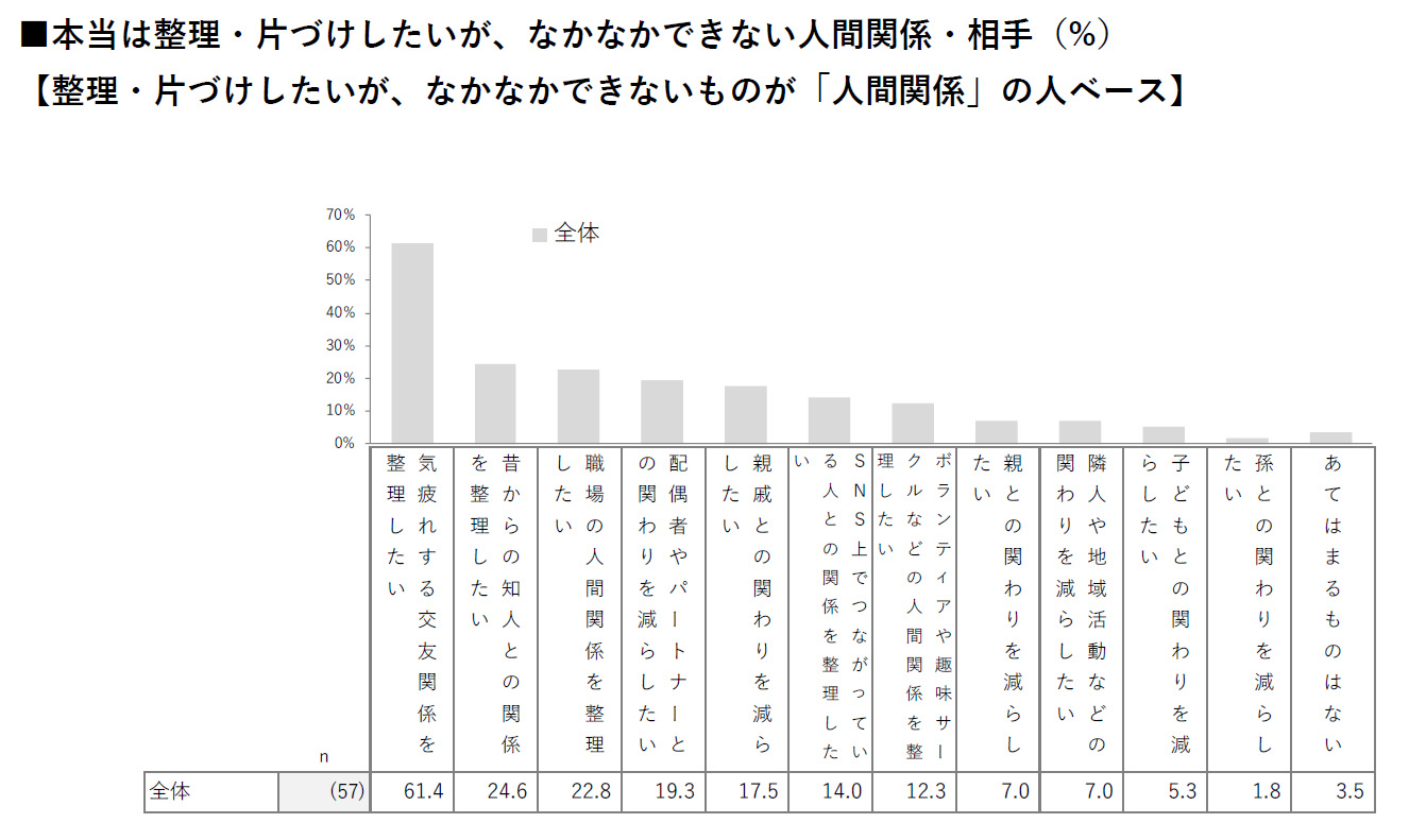 「整理・片づけしたいが、なかなかできない人間関係・相手」の最多は「気疲れする交友関係(61.4%)」。次いで、「昔からの知人(24.6%)」「職場の人間関係(22.8%)」「配偶者やパートナー(19.3%)」などが挙げられた。