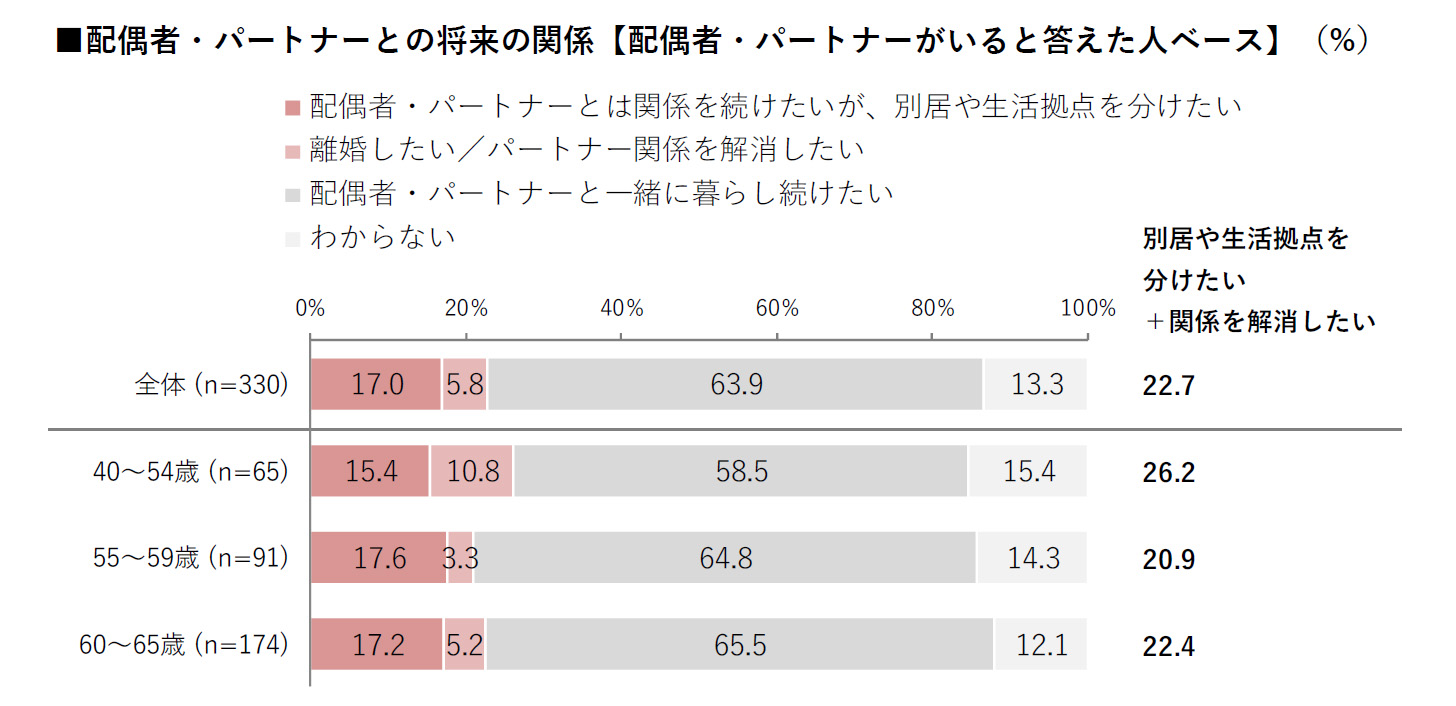 「将来的に配偶者・パートナーとの関係をどのようにしたいか」という質問では、「配偶者・パートナーとは関係を続けたいが、別居や生活拠点を分けたい」または「離婚したい/パートナー関係を解消したい」と回答した人が合わせて22.7%という結果も。