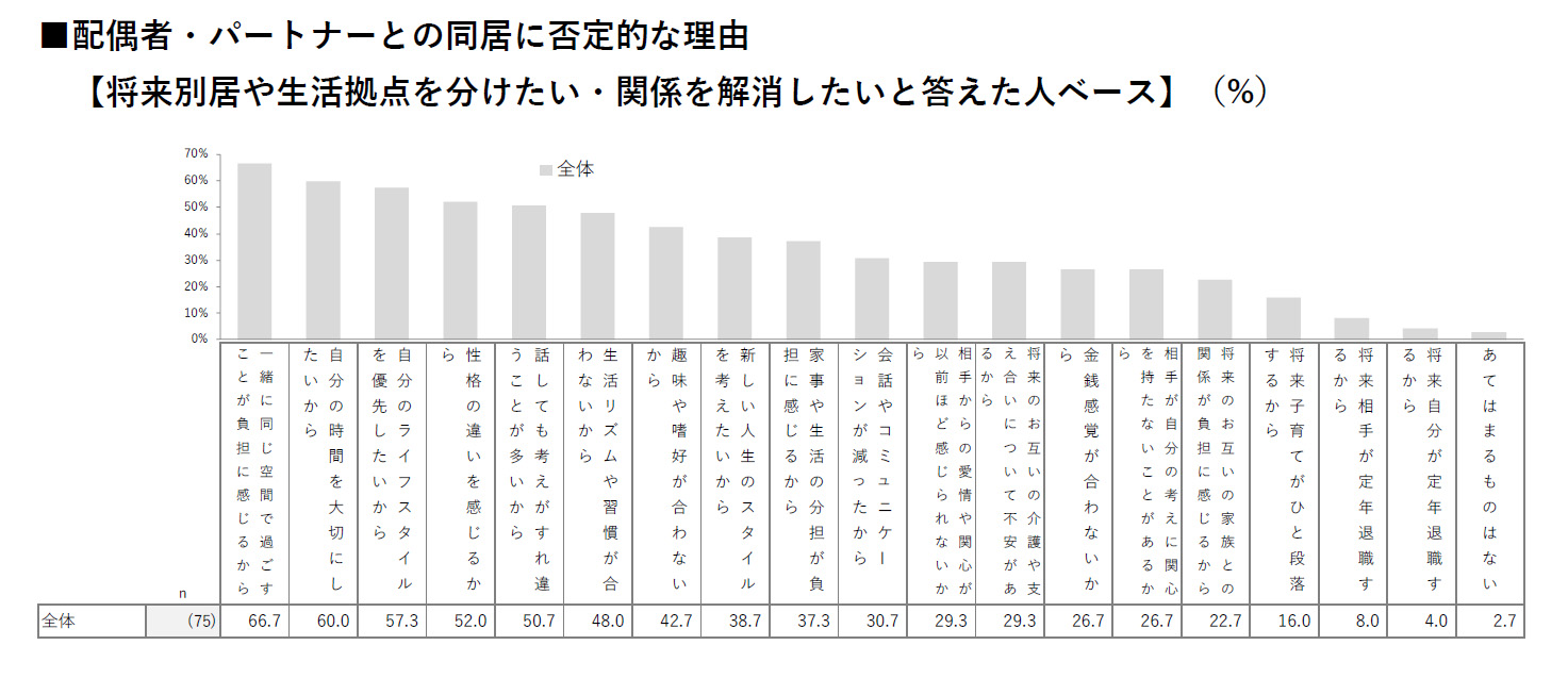 その理由として「一緒に同じ空間で過ごすことが負担(66.7%)」「自分の時間を大切にしたい(60.0%)」「自分のライフスタイルを優先したいから(57.3%)」などが挙げられた。