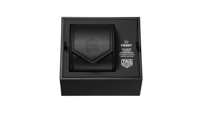 このタイムピースのデザイン理念が反映されたパッケージには、タグ・ホイヤーとフラグメントそれぞれのロゴが目立つように配置され、対照的な黒と白で表現。