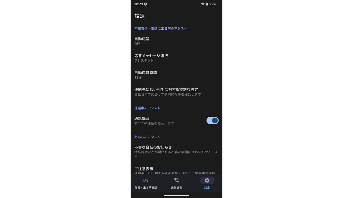 電話では、「電話アシスタント」も利用できる。これは、AIに電話を代わりに出てもらう機能のこと。着信時に「代わりに聞いときます」というボタンをタップすると、相手とのやり取りをAIがして、それを録音し、結果を文字として表示してくれる。