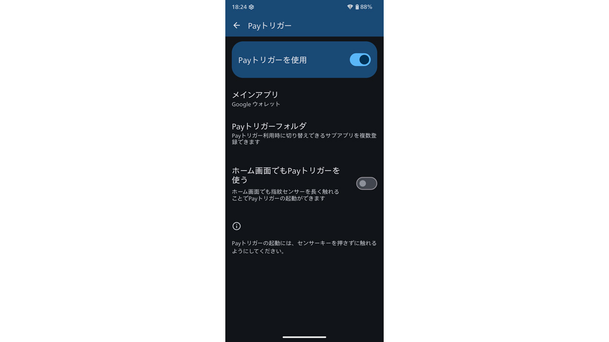 OSはAndroidの標準に近い形だが、独自機能は「AQUOSトリック」という形できちんと実装されている。その1つが、指紋センサーでのロック解除と同時にアプリを立ち上げる「Payトリガー」。これは、キャリア各社のQRコード決済アプリを想定したもの。あらかじめ登録したアプリを画面ロック解除時に、自動で起動できる。