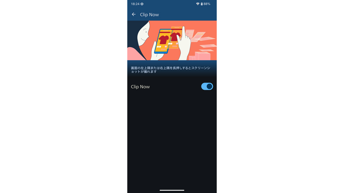 細かなところだが、スクリーンショットを簡単に取れる「Clip Now」という機能も便利だ。これを有効にしておくと、画面の右上、左上のどちらかを長押しするだけでスクリーンショットが記録される。通常だと、電源キーと音量キーの下を同時押ししなければならず、操作が少々面倒。持ち方を変えなければならないため、その際にポロっと端末を落としてしまうこともあるが、Clip Nowのような操作方法ならその心配も少なくなる。