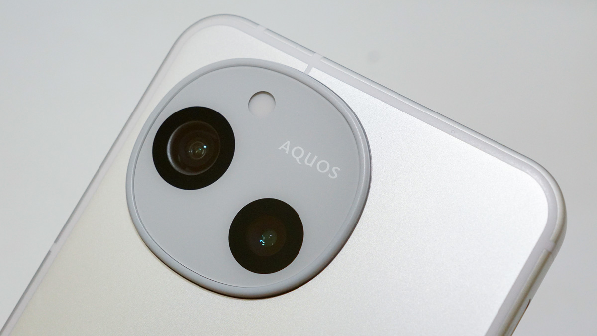 カメラ周りは独特なデザインで、2つのレンズが非対称に配置されている。人によって何に見えるかは異なるが、筆者は「天空の城のラピュタ」に登場するロボット兵のような面影があるように感じた。こうしたデザインは、miyake designの三宅一成氏によるもの。好き嫌いは分かれるかもしれないが、個性的なデザインで、一目でAQUOSシリーズと分かる。