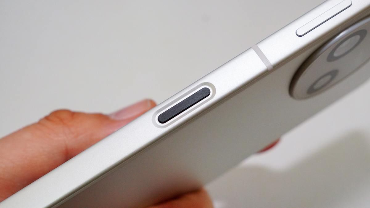側面には、指紋センサーと一体になった電源キーが配置されている。ハイエンドモデルでは、画面内指紋センサーを採用したモデルが多く、AQUOSシリーズでも「AQUOS R9 Pro」は超音波式の画面内指紋センサーを搭載している。その点で言えば、電源キー一体型はミッドレンジモデルの仕様だが、実際の使い勝手はむしろこちらの方が上。ある程度正確に画面の中に指を置く必要がなく、手探りでもロックを解除できるからだ。