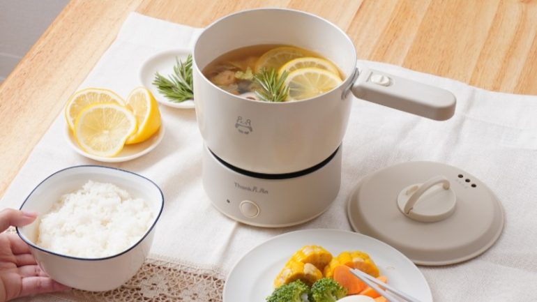 1食作るのにちょうどいいサイズの片手電気鍋。食材を入れてスイッチを押すだけの簡単操作で、ラーメンやポトフなど自分専用の鍋料理が手軽に楽しめる。
