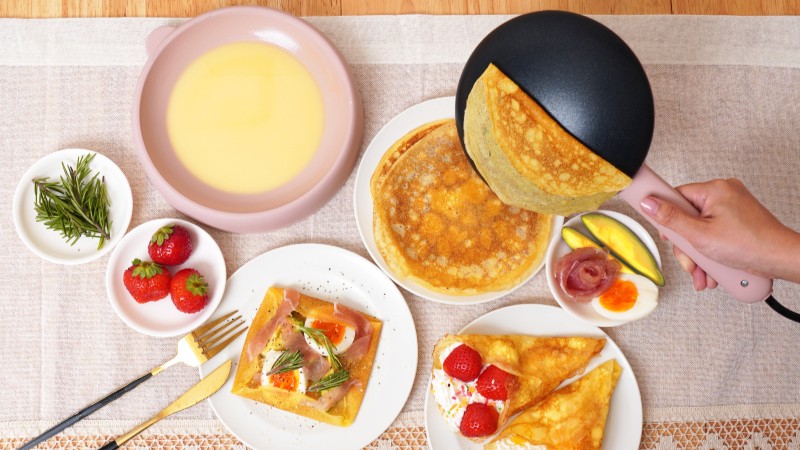 また、付属の専用トレイを使うことで生地を無駄なく焼くことができ、焼き上がりも剥がれやすいため、誰でも簡単に薄くてきれいなクレープが作ることが可能だ。