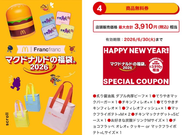 まずはマクドナルドの福袋です。マクドナルドは毎年事前応募があり、抽選で当たったら購入することができます。今年は12月9日(火)まで応募できます。