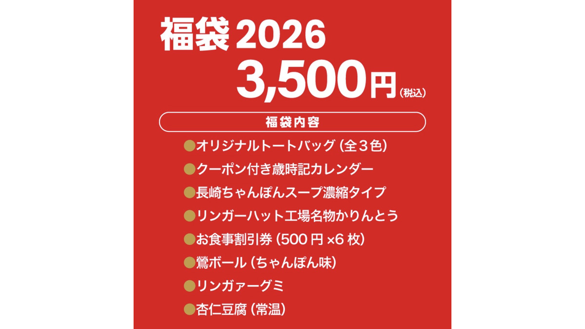 リンガーハットも福袋を販売します。こちらは予約や抽選はなく、12月10日(水)から店頭で販売されます。僕は昨年こちらの福袋を購入しました。お店によっては発売当日に売けれたところもあるほど人気の福袋となっています。