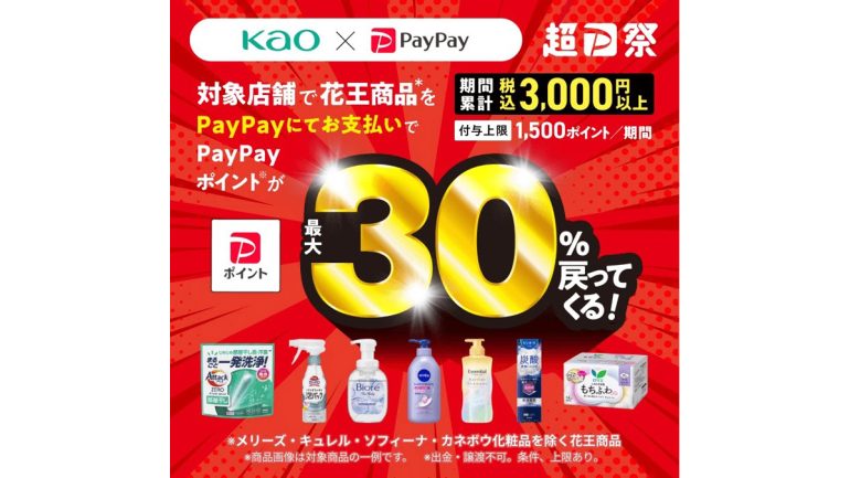 今回は対象店舗で花王商品をPayPayで購入すると最大30%戻ってくるというキャンペーンです。キャンペーン期間は12月1日(月)~12月31日(水)までで、この期間中に累計3,000円(税込)以上購入でキャンペーンが適用されます。
