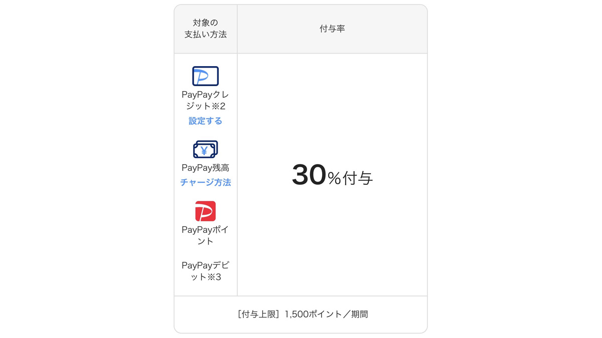 PayPayの支払い方法はPayPayクレジット、PayPay残高、PayPayポイント、PayPayデビットと4つあり、今回はすべてがキャンペーン対象に。