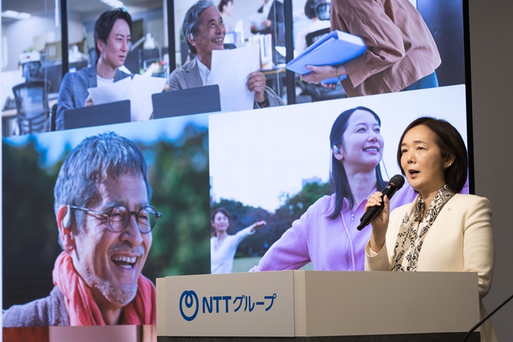 NTTグループが長年にわたり培ってきた音の技術、知見を活かした、補聴器でもイヤホンでもない新しい音の響き方、聞こえ方で、聞こえづらいと思っていらっしゃるみなさまの暮らしを、もっと楽しく、豊かに、自由にしたいと考えています」(NTT株式会社 常務取締役 大西佐知子氏)