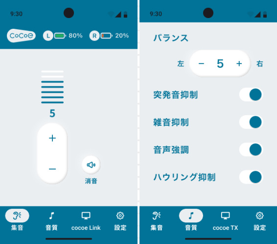 cocoe Earも軽度な聞こえづらさを感じる人に使う製品と位置付けられており、自然の音と聞こえづらい音域を増幅するハイブリット伝達になっている。