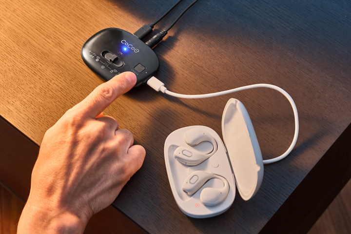 世界初のオープンイヤー型集音器であるcocoe Earは、周囲の自然音はそのままに、相手の声や必要な音を自然に拡張する「ハイブリッド伝達」を採用している。