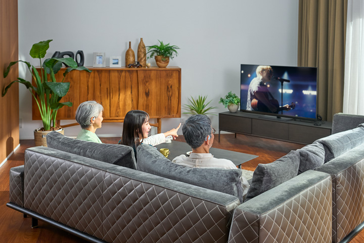 テレビと集音器がボタン一つでセキュアに接続され、自分にあった音量でテレビを聞きながら、集音器として周囲とコミュニケーションをとることが可能で、一人でも大勢いる中でも、自分に合った音量でテレビ視聴ができる。