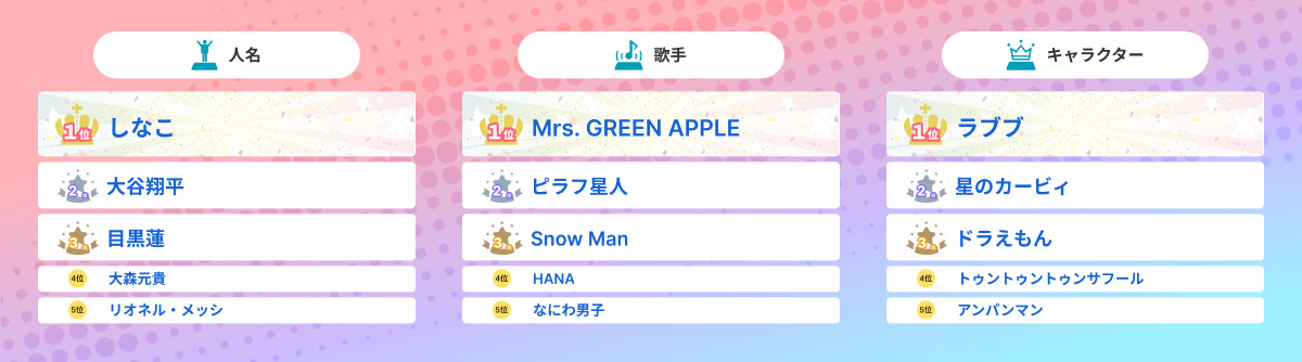 人名部門では、1位に原宿系クリエイター「しなこ」が登場し、昨年1位だったロサンゼルス・ドジャースの「大谷翔平」は引き続き高い関心を集め、2位にランクインした。