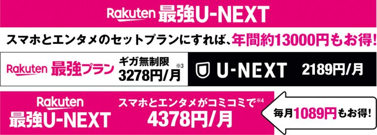 音楽・動画、コミック・雑誌、スポーツなど、エンタメコンテンツを定額料金で思う存分楽しめるサブスク。よく利用している時はお得なのだが、使わなくなっても解約しない限り、毎月料金がかかってしまう。初月は無料で使えるが、その後、自動更新されて知らずに料金を支払っているケースも多い……。そんなサブスクを見直すことで、年間数万円の節約に繋がることも。また、最近ではエンタメコンテンツがセットになったスマホの料金プランも増えている。例えば楽天モバイルの新プラン「Rakuten最強U-NEXT」※2は、「Rakuten最強プラン」と「U-NEXT」を別々に契約するよりも月額1089円もお得。セットにすることでスッキリまとめられる。