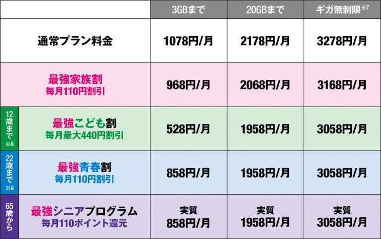 ※2:最強とはデータ無制限の価格が最安の意味。家族割引のみ適用しその他割引は含めない場合の価格を他キャリアと比較。2025年6月時点自社調べ。