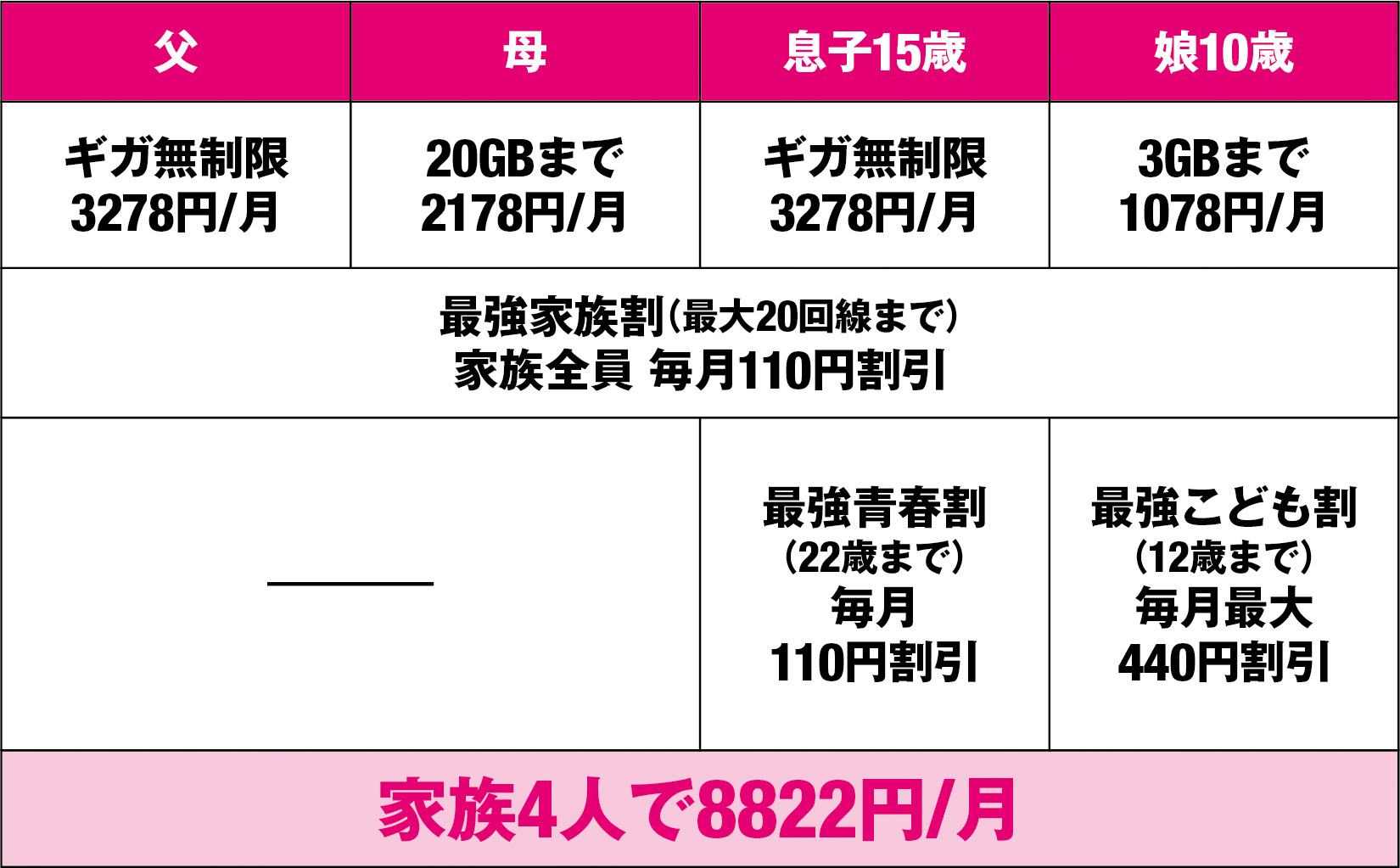 「Rakuten最強プラン」を家族で利用すると月額いくらになるのか、4人家族で試算してみた。父と15歳の息子がギガ無制限、母が20GBまで、10歳の娘が3GBまでで計算したところ、月額8822円という結果になった。各自のデータ使用量が少なければ、もっと安価にできる。家族で乗り換えて年間15万円以上の節約というのも夢じゃない!?